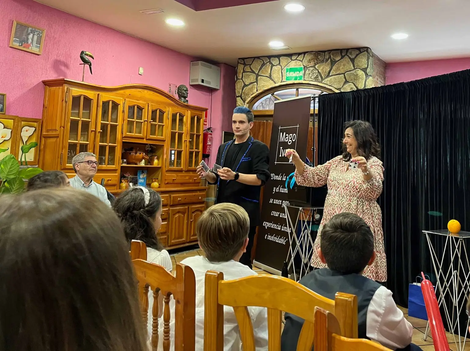 Únicamente necesito un enchufe cerca, llevaré todo lo necesario. Siempre voy a acompañado de mi equipo de sonido, escenografía y un técnico de sonido profesional, esto me permite trasladar el show que haría en un teatro de verdad al cumpleaños.